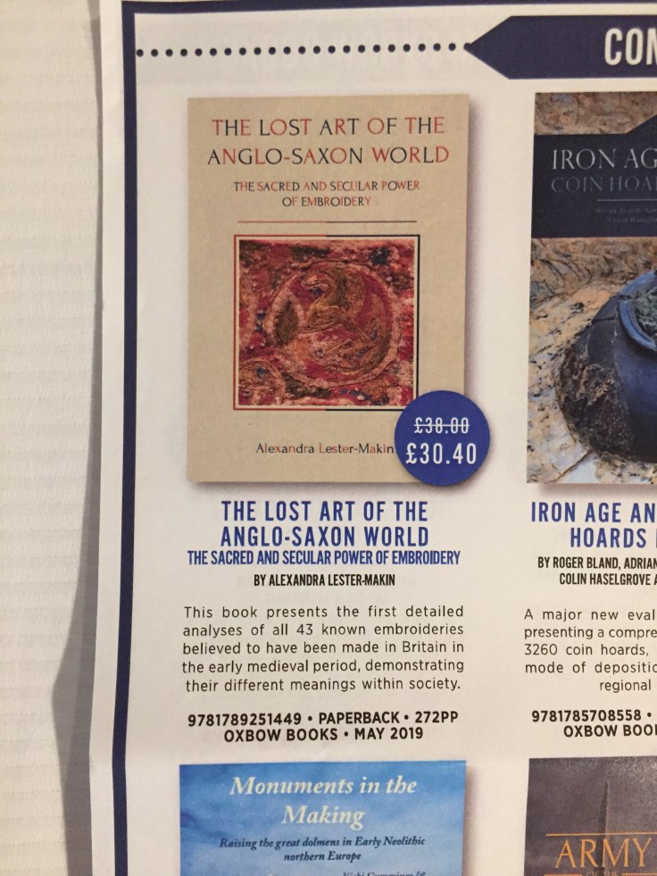Now my first book, 'The Lost Art of the Anglo-Saxon World: the sacred and secular power of embroidery', is out (see blog), I am concentrating on the Cuthbert recreation project (also see blog and Instagram: @alexandramakin2). I am also working on an article exploring how people viewed embroidery in early medieval England, which I hope will be published later this year. In between these projects I am in the early stages of organising an edited volume based on the well received session I organised and ran at the IONA conference in Vancouver, Canada, last April. Keep an eye on the blog and Twitter (@alexandra_makin) for updates.