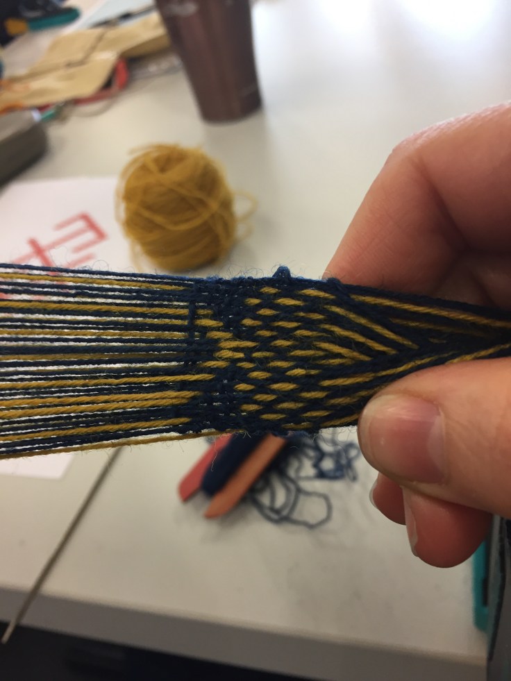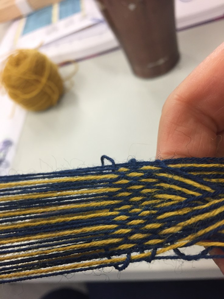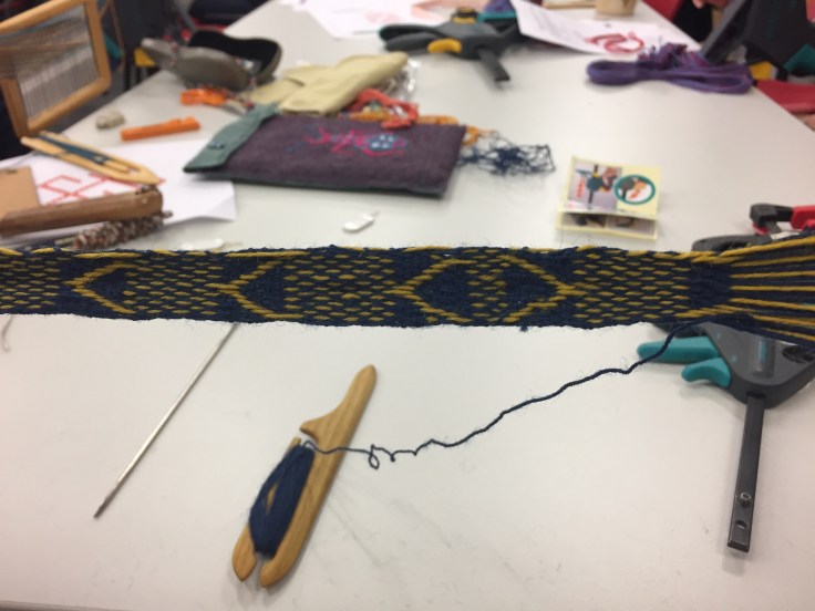 Today we heard about ridged heddle weaving, braided laces from Tyrol and experimental work with tablet weaving. We also had a go at ridged heddle weaving.