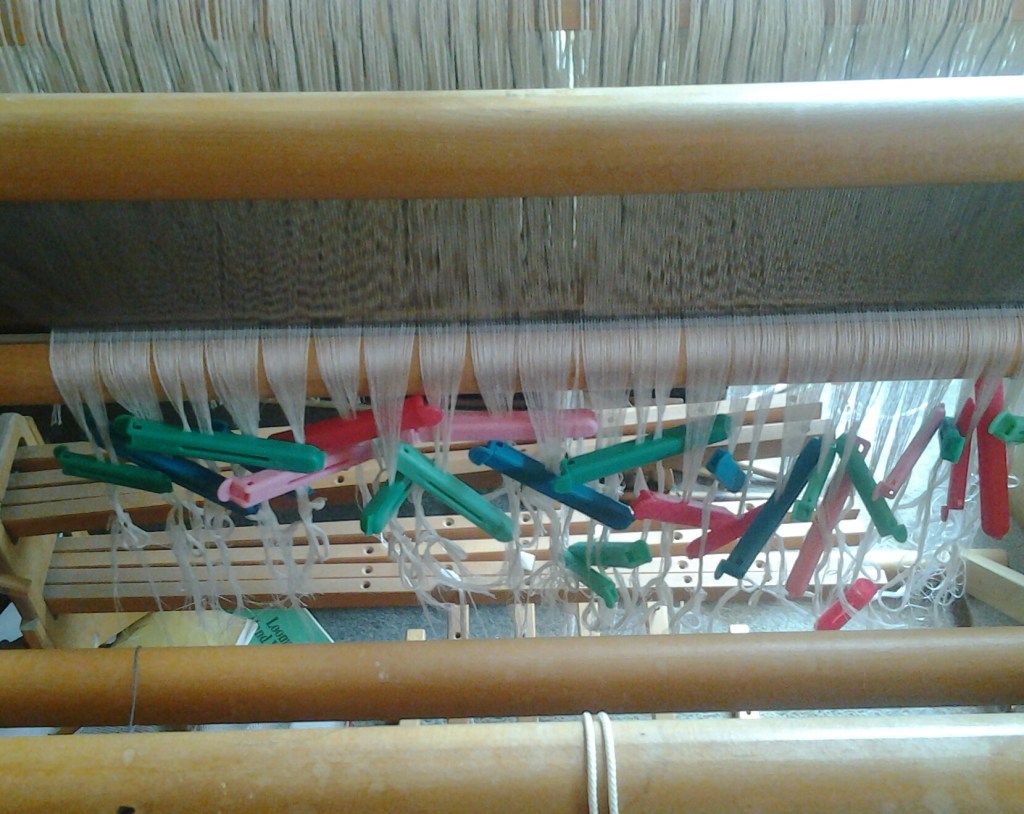 Fourth decision: warp back to front in very, very small batches and short (no more than 2m) lengths, oh and use Klippets (plastic clips for keeping bags closed) at every stage to keep control of the batch (I love Klippets). There were other decisions from leaving broken ends exposed rather than cross them over in the weft/warp as I though it may confuse the count when embroidering; how much tea was I likely to need per day; bulk buying mint crumbles/de-tangler/Klippets, but they are minor ones.