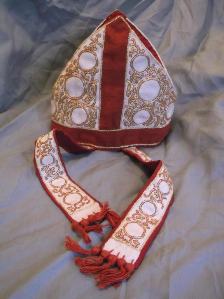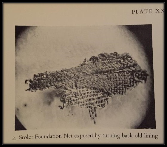 I’ve just re-looked at the analysis in Battiscombe, just to double check, and nothing is mentioned about how the band was attached to the stole, in this photo, or the maniple or probable ribbons.