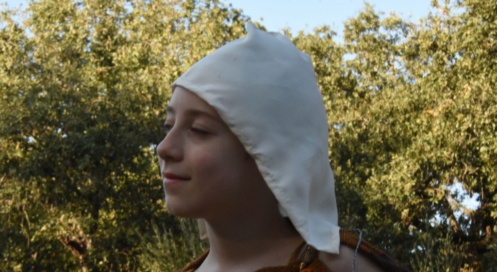 These caps are incredibly useful. They protect hair from dirt, biting insects, and the sun. They are secure in most weather conditions, including very windy days. Daily use of the items is part of the educational process for experimental archeology. This works out small glitches with patterning and stitches.
