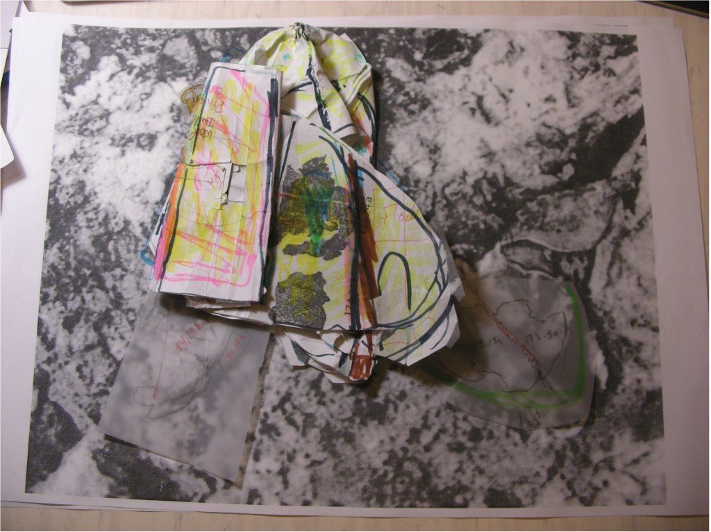 The two key elements for the reconstructions were the in situ photo of the leather group under the great silver dish and the layers of textiles and flock still adhering to some of the fragments. Drawings and photographs of the fragments were matched to what was visible in the in situ photograph, which sounds simple but took three years of research. Countless paper models were made incorporating the fragments and crosschecked with photographs of the fragments. The layers of textile and flock encrusted to certain leather surfaces provided a micro stratigraphy showing how the fragments had been deposited. In this case, the paper models were used to make sense of the placement situation of the leather pieces under the great dish, the textile layers adhering to the inside of the bags showed they had been deposited with the front flaps folded around the back of the body of the bags, and placed on top of the pair of shoes. Colour coding of the textile layers also provided a method for clearly visualising their placement. The various versions of the paper reconstructions underwent a great deal of handling and sometimes were composed of more cellotape than paper!