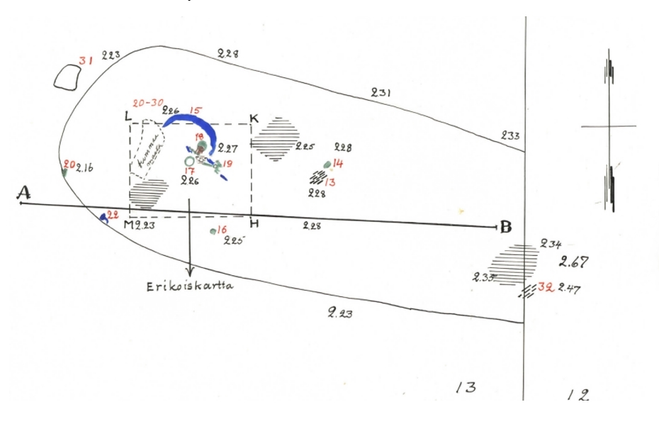 Yläne Anivehmaanmäki is a Viking Age inhumation cemetery, excavated in the 1950s. Grave number 47 has a large grave pit, enough to accommodate an adult individual – and based on the dark soil coloured by the decomposition fluids, it belonged to an adult. The preservation of bones at Anivehmaanmäki is extremely poor, and they – along with the textile fragments – have been preserved only as fragments in contact with bronze objects.