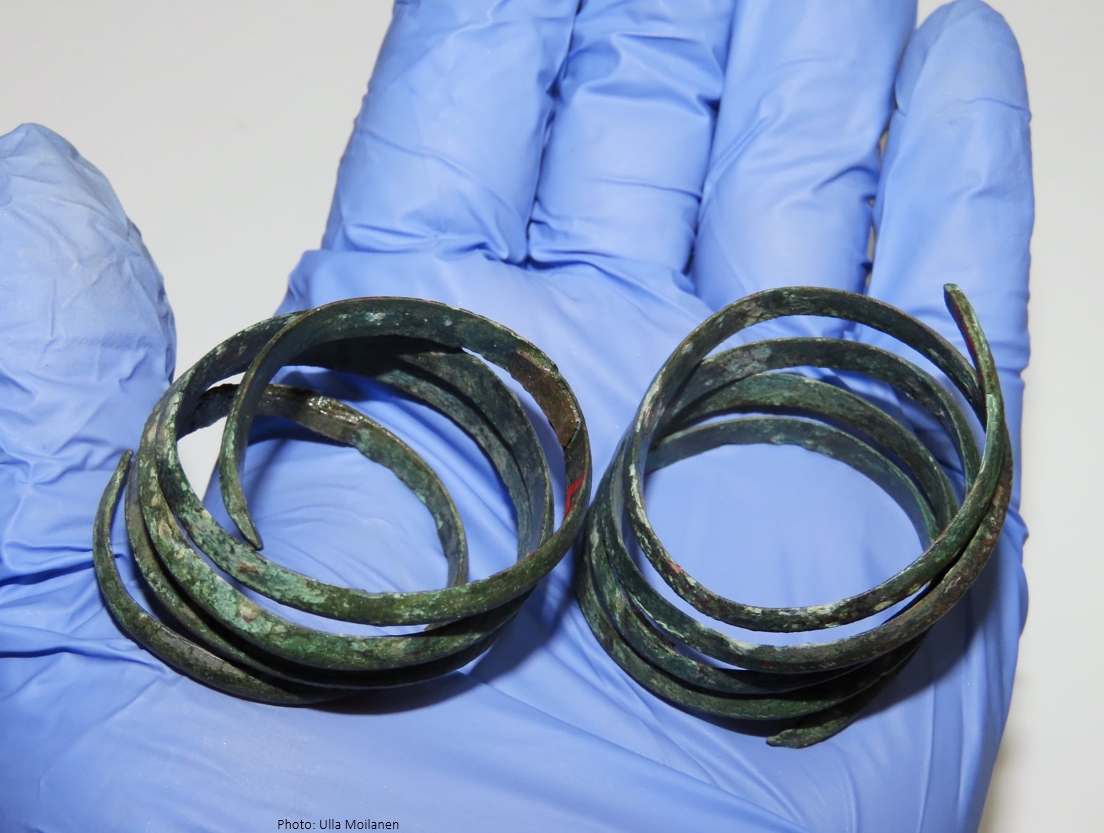 This analysis based on the objects and the organic remains is supported by the only bone fragments found from the grave. They are poorly preserved remains inside the small spiral arm rings described above and a finger ring found at the mid-section of the grave. The bones inside the arm rings are arm bones, and they indeed belong to an infant. The almost vertical position of the arm rings could be explained by the position of a new-born infant’s arms: they are naturally flexed and bent at the elbows.