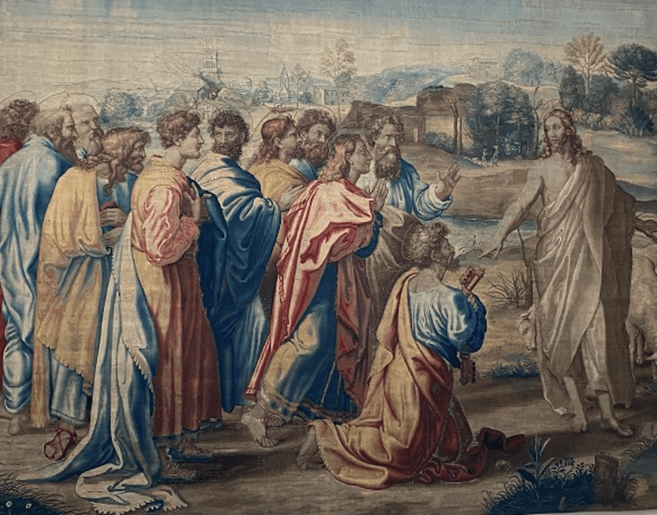 Tapestries are a good example of this phenomena. The tapestry depicting Christ’s Charge to Peter, illustrated here (Fig.2), presents with browns, greys and blues but turn it over (Fig. 3) and it feels like an entirely different tapestry. The rainbow colours of the apostle’s robes are vibrant, the palette joyful and bright. I find such pleasure in these colours, it’s as if I’ve put-on rose-tinted glasses. Somehow I feel the original, often hidden, colours of a textile reflect the joy of those who created and loved them. Perhaps if those people wanted a rainbow palette, then they might have been more colourful and less serious than I’ve personally imagined. The vibrant colours seem modern and I feel the distance of time lessen and more connected to the past.