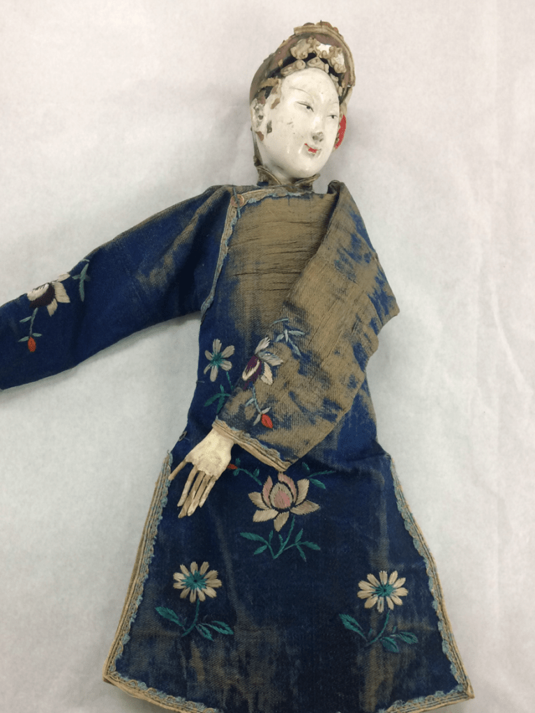 Of course it isn’t only tapestries but costume, upholstery and other smaller objects that suffer light damage. The little Chinese opera doll in Fig. 4 was displayed with her arms crossed in front of her while she sat on a shelf. It can be clearly seen where the sunlight fell on her. It’s completely bleached the rich blue out of her costume and severely weakened the silk; the weft threads (those woven horizontally) are almost entirely missing now. Her ceramic face however remains in good condition, largely unaffected by the light. I’d love to go back in time and be able to lift her off the shelf and place her somewhere out of the direct light!