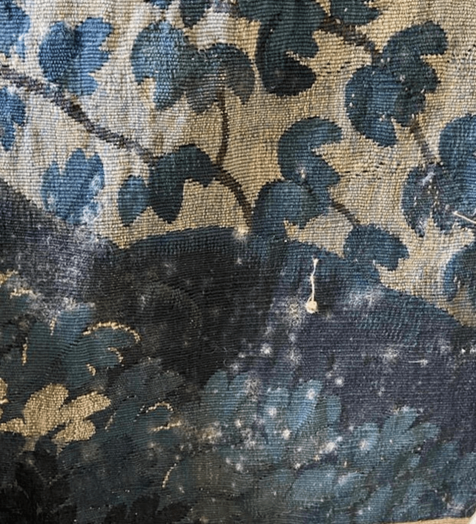 Similarly, the changes in colours can skew the original intent of a piece. Sticking with tapestries, many were woven in places with gold or silk threads. One reason being to illustrate the wealth of the owner but there was a deliberate visual element too. Lit up by firelight the silk and gold threads must have shone, animating the tapestry as the light flickered across the surface, the blues of the sky lit up as if by sunlight. Over the decades, silk disintegrates while (non-pure) gold thread tarnishes. Darkening over time causes a reversing of tone, light areas become dark, entirely changing the look of a tapestry, so that we must see a very different piece to those who saw it originally.